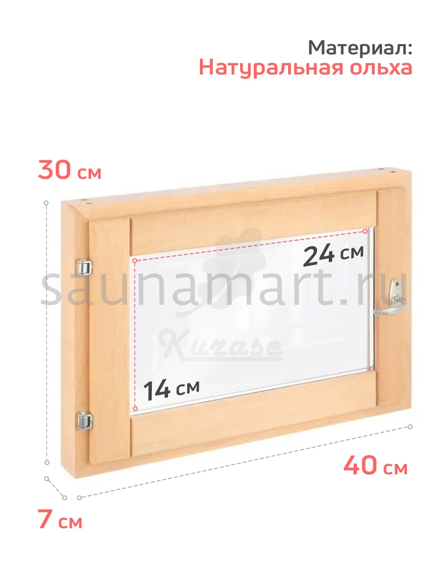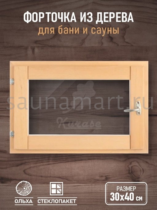 Окно для бани из ольхи. Форточка для бани в ассортименте 40х50, 40х40, 30х40 см. Однокамерный стеклопакет. Окошко из прозрачного стекла. Деревянная рама с фурнитурой в комплекте: петли, ручка и затвор. Банное остекление готово к установке нужно только прикрутить ручку. Маленькое окно в парилку снижает теплопотери, обеспечивает проветривание, вентиляцию и поступление дневного света. Деревянное окно необходимый атрибут в русской бане, как дополнение к системе воздухообмена. Одновременное открытие банной двери и окна образует сквозняк, позволяющий обеспечить тщательное проветривание, для сохранности и долговечности внутренней отделки стен, пола, потолка, печи и полок в бане. Оконная рама из лиственных пород, не выделяющих смол, прекрасно переносит условия высокой влажности и температуры, демонстрируя: влагоустойчивость, устойчивость к гниению и образованию грибка. Деревянная форточка может быть использована для строительства и ремонта гаража, дачного туалета и душевой, дачного домика.