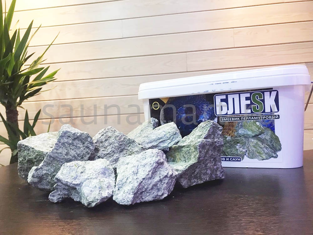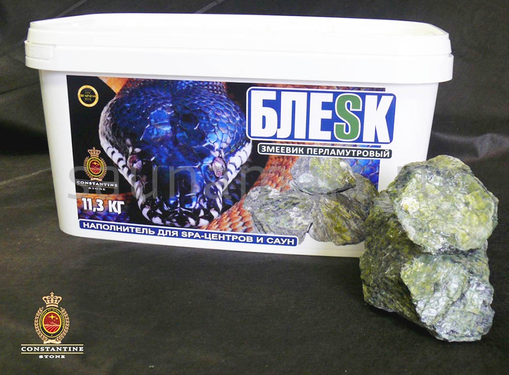 Камень для бани «Блеск Змеевик Перламутровый» (принадлежит «Камень Константина») - это камень-наполнитель, представляющий собой произведенную по оригинальной технологии, обработанную, фракционированную и особым образом смешанную продукцию из натуральных горных пород для печей открытого горения, электропечей, газовых печей. Используется в банях, саунах, турецких банях (хамам).