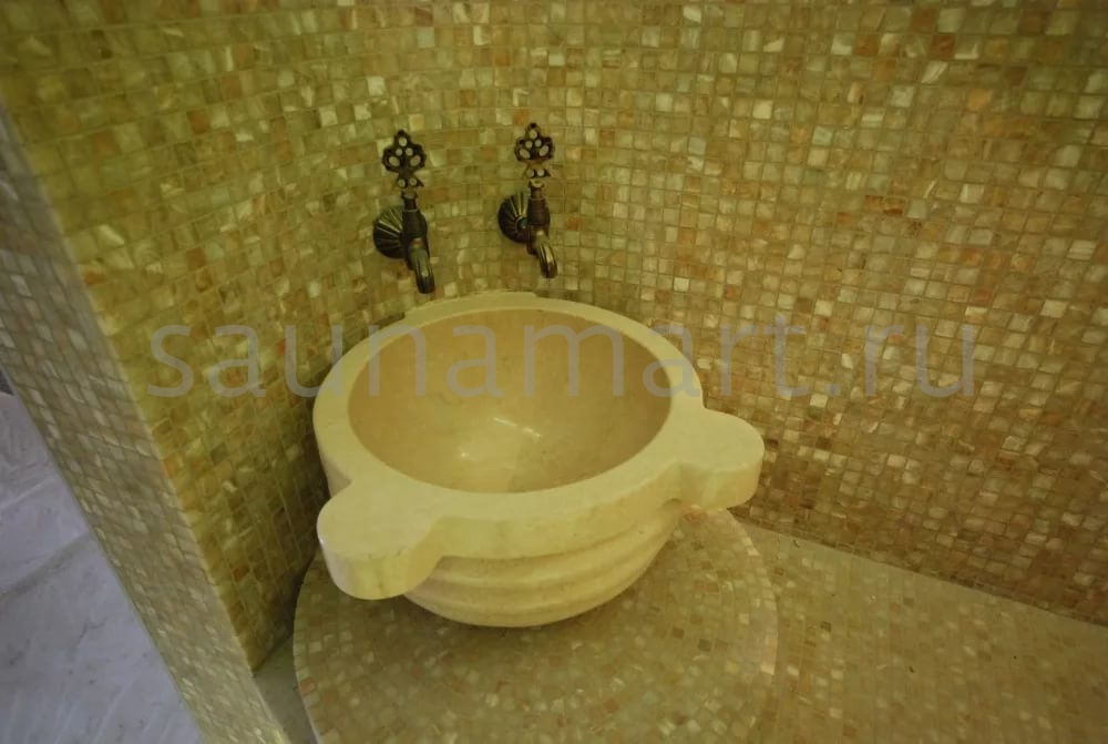 Курна – элемент интерьера турецкой бани, она используется для омовения. В курну без слива вода поступает напрямую из смесителя и изящно выливается через край. Мраморная чаша устойчива в условиях повышенной влажности, а это значит, что она прослужит Вам долгие годы. Курна Камнирус КМ08 имеет утончённую округлую форму. Она устанавливается вплотную к стене. Такая деталь сможет создать особую этническую обстановку и прекрасный микроклимат в Вашем хамаме.