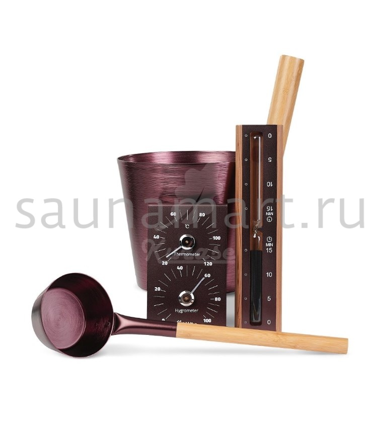 Банные принадлежности и аксессуары, которые входят в набор: ушат, черпак, песочные часы, термогигрометр. Выполнены из алюминия в цвете серебро с деревянными элементами из бамбука. Ушат для бани предназначен для мытья, кадушка для обливания, разведения ароматических масел, как запарник для настаивания трав. Банное ведерко применяют для запаривания веника банного, как таз для воды и обливное ведро, ковш для поливания каменки. Для удобства, шайка для бани оснащена деревянной ручкой, которая убережет руки от ожога.