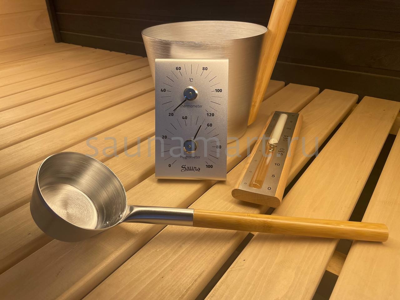 Банные принадлежности и аксессуары, которые входят в набор: ушат, черпак, песочные часы, термогигрометр. Выполнены из алюминия в цвете серебро с деревянными элементами из бамбука. Ушат для бани предназначен для мытья, кадушка для обливания, разведения ароматических масел, как запарник для настаивания трав. Банное ведерко применяют для запаривания веника банного, как таз для воды и обливное ведро, ковш для поливания каменки. Для удобства, шайка для бани оснащена деревянной ручкой, которая убережет руки от ожога.