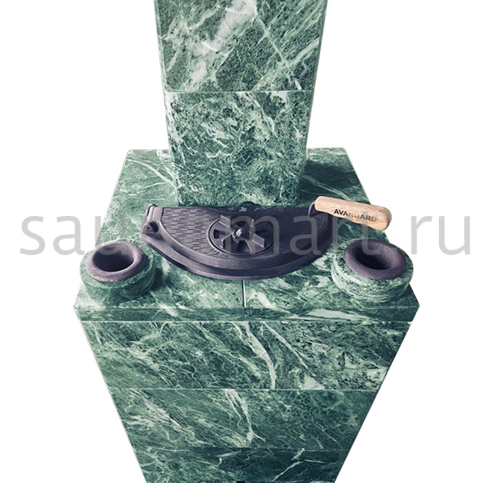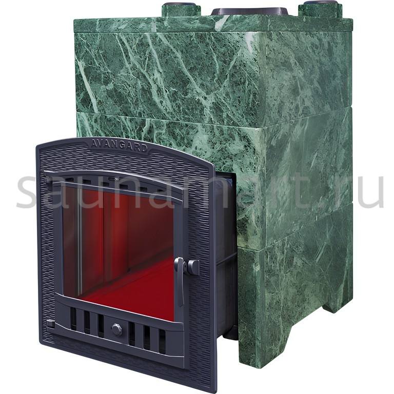 Облицовка «Классика Змеевик» для печи AVANGARD 24 М/П представляет собой верхнюю секцию высотой 790/40 мм из натурального змеевика. Печь оснащена 56-кг пароиспарителем с увеличенной рабочей площадью и системой рассекателя пламени для оптимального нагрева.