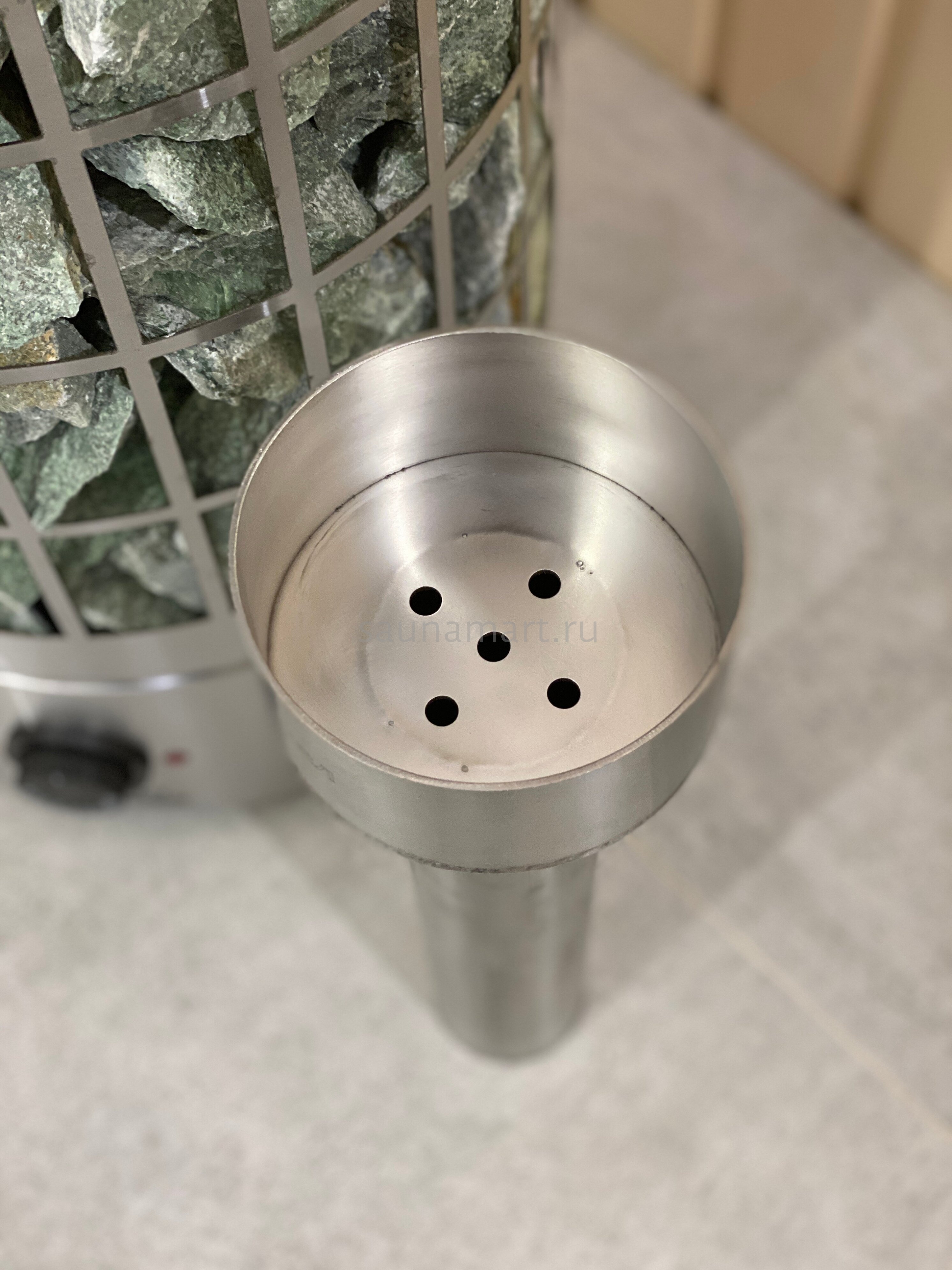 В комплектацию парообразователя входит : сам пароиспаритель (нержавеющая сталь 304 марка, толщитна 2мм), камень в чаше фракция 10-20мм (кварцит малиновый). Данная конструкция легко встраивается между трубчатыми электронагревателями (ТЭН) и камнями. Колба наполняется водой через отверстия в чаше.