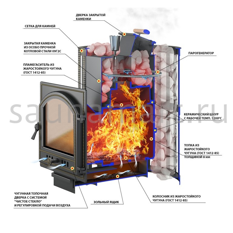 - Материал закрытой каменки: особо прочная котловая сталь (09Г2С)