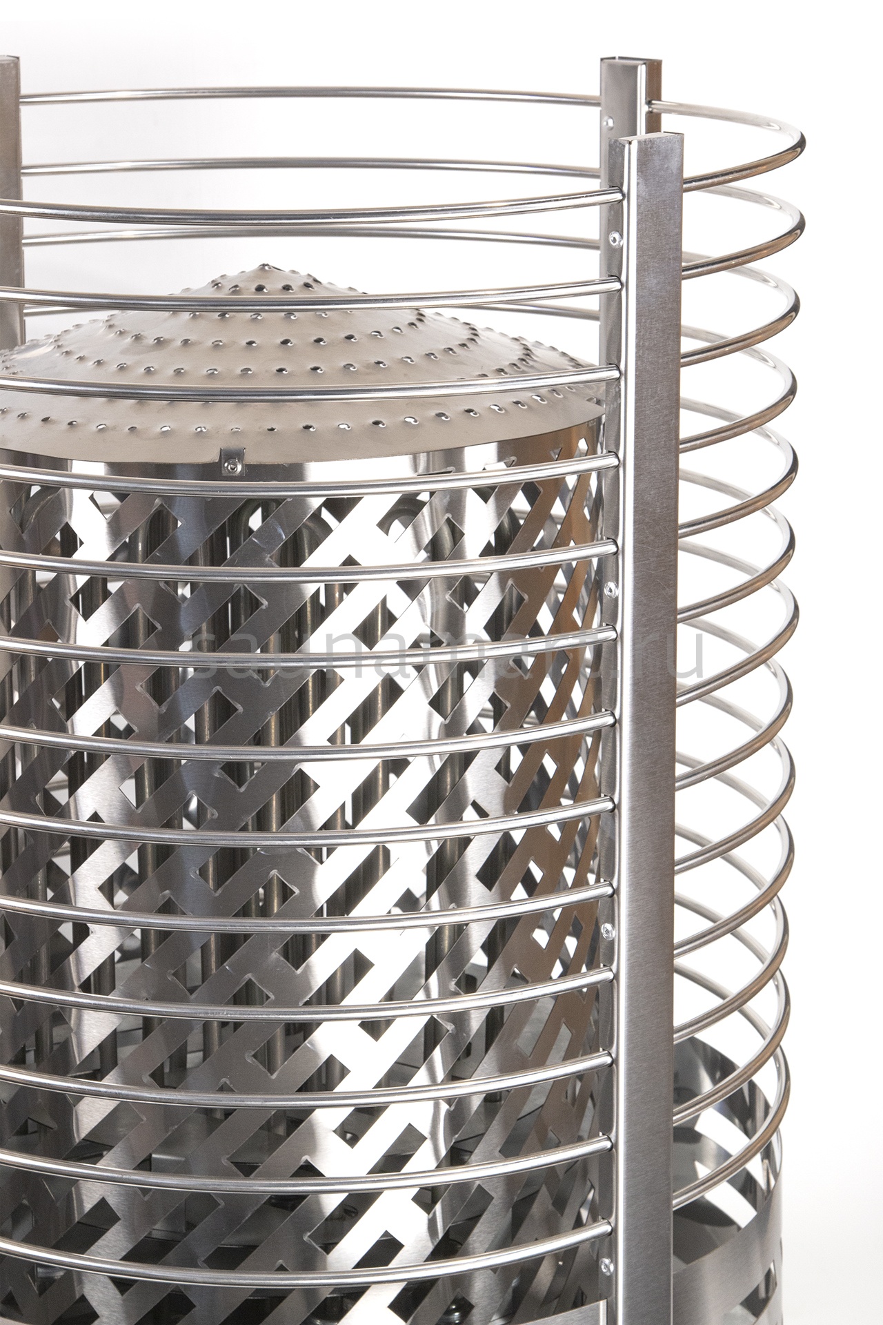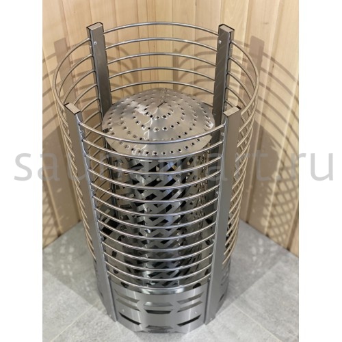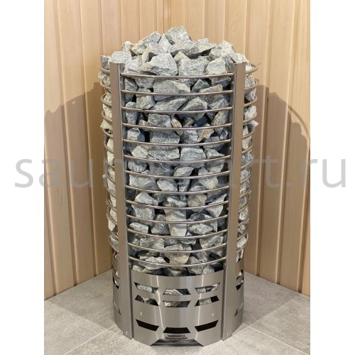Печь оснащена встроенным механическим терморегулятором. Нагревательные элементы (ТЭНы) выполнены из нержавеющей стали. Вариант размещения - напольный, требует установки на негорючую поверхность. Каменка открытого типа с фронтальной загрузкой камней. Пароиспаритель отсутствует - пар образуется при ручном поливе камней. Комплектуется защитным экраном и термостойким кабелем.
