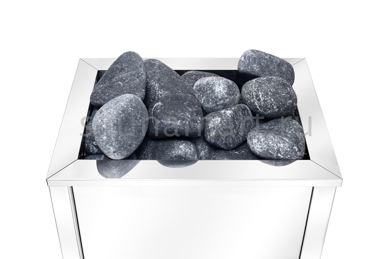 Представленная модель электрокаменки имеет отсек для камней, который вмещает до 15 кг. Она монтируется напольно.