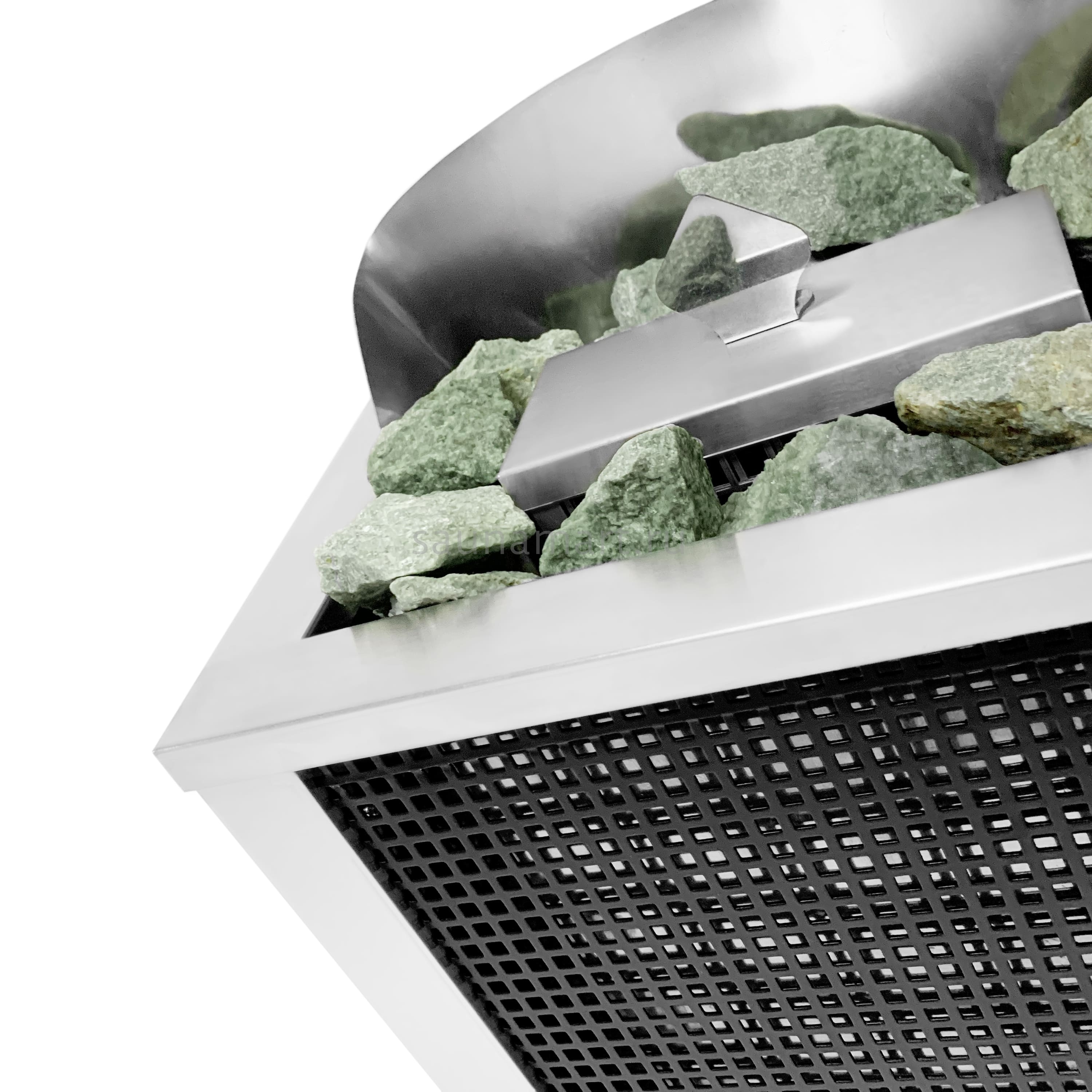 Все корпусные элементы выполнены из нержавеющей стали, лицевая часть печи выполнена из просечного листа для меньшего нагрева и меньшей вероятности получить ожог при соприкосновении с печью. Нагревательный элемент в данной печи ТЭН диаметром 10мм.