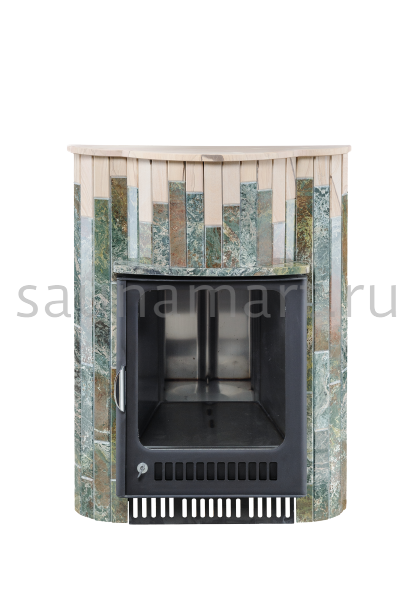 Для печи «Оптима» серии ПФ производитель V?hringer выпускает порталы из натурального мрамора, змеевика и жадеита. Облицовочные материалы поступают на завод в слэбах, заготовки разрезают на пластины, которые затем навешивают на печь.